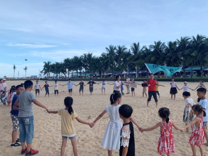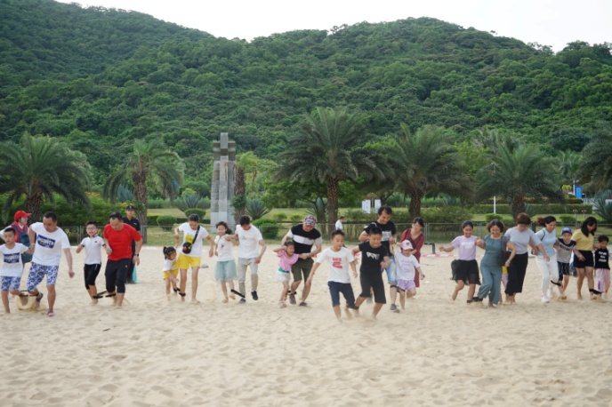 在随后开展的沙滩游戏中,家长和孩子们乐开了花,欢笑声、呐喊声在海边回响。两人三足亲子活动中,家长和孩子团结协作向终点前进,有效增进了孩子与家长之间的感情。