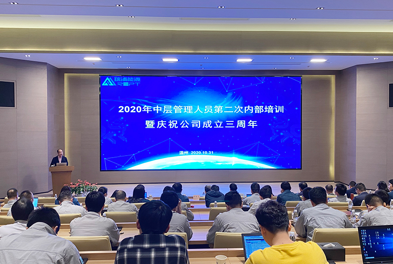 10月31日,瑞浦能源有限公司举行了2020年中层管理人员第二次内部培训暨庆祝公司成立三周年大会。永青股份董事长胡晓东,瑞浦能源特聘专家夏保佳、高层领导,温州生产基地和上海研发基地各部门中层管理人员,主管、工程师代表共计80余人参与此次培训会。